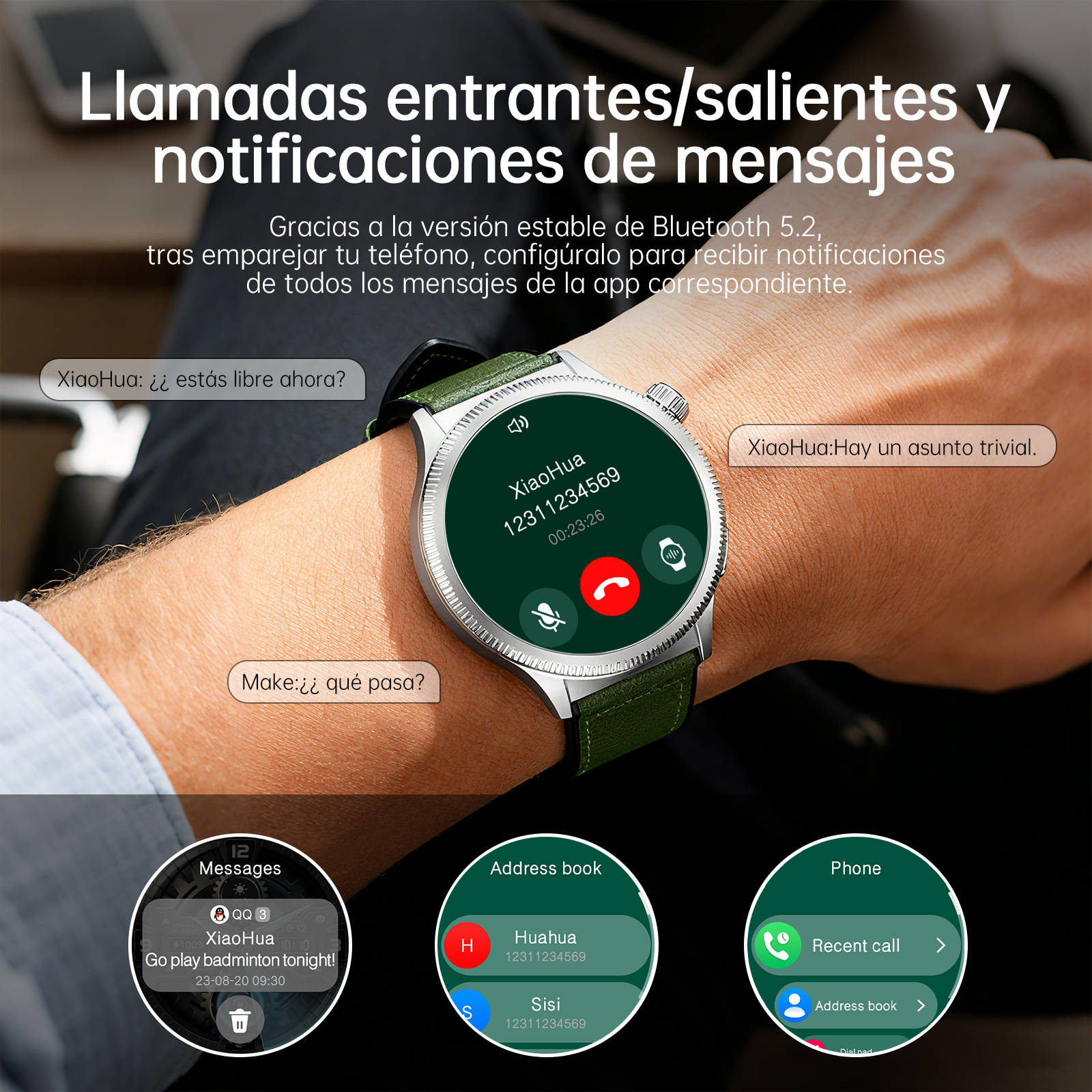Suporta notificações de mensagens de todos os aplicativos, permite atender e fazer chamadas após emparelhar com um telefone, suporta 7 dias em standby e carrega em 1 a 2 horas.