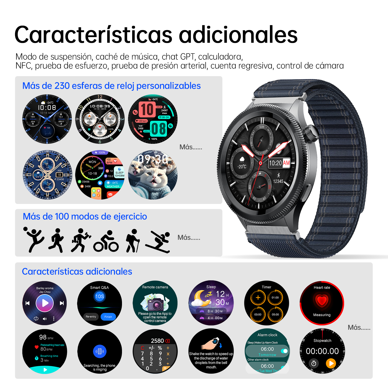 Chamadas / Oxigênio no Sangue / Freqüência Cardíaca / Monitor de Estresse / Pedômetro / Controle de Música / Câmera Remota / NFC / Notificações Inteligentes / Despertador /Clima